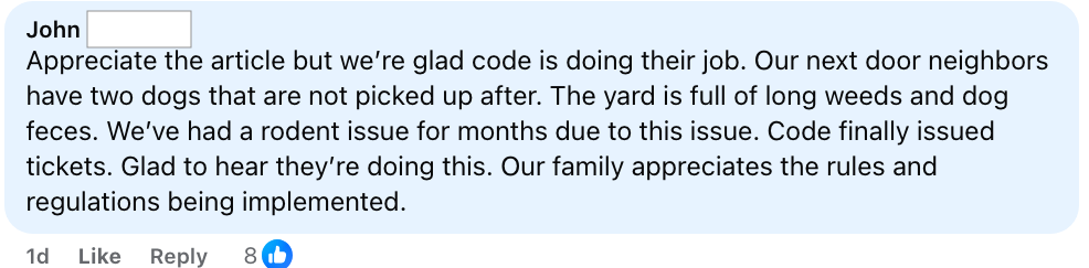 Multiple comments from residents, like John or Mike, expressed approval for the spike in tickets that occurred last June. They saw the increase as evidence that code enforcement was “doing their job.”