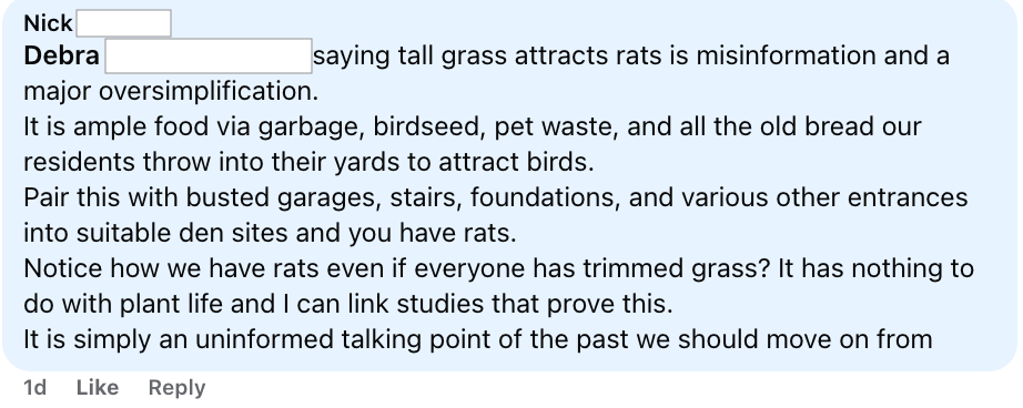 We hate the rats, too. It has long been accepted that tall grass and overgrown weeds can be places for rats to hide. Though it seems unfair to say that neighbors who complain about rats are the same ones who do not take care of their lawns.