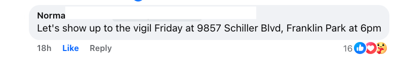 Finally, a fair amount of people endorsed Norma’s suggestion to show up to a community vigil on Friday, September 19, at 6 p.m. at the First Methodist Church of Franklin Park.