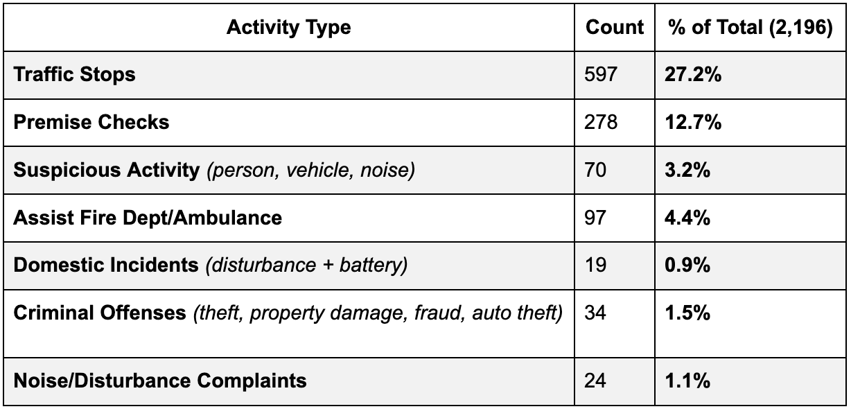 Over 40 percent of all incidents are routine safety or traffic-related (traffic stops or premise Checks) and criminal or high-disruption activity (e.g., theft, domestic incidents, disturbances) collectively accounts for under five percent of all activity.