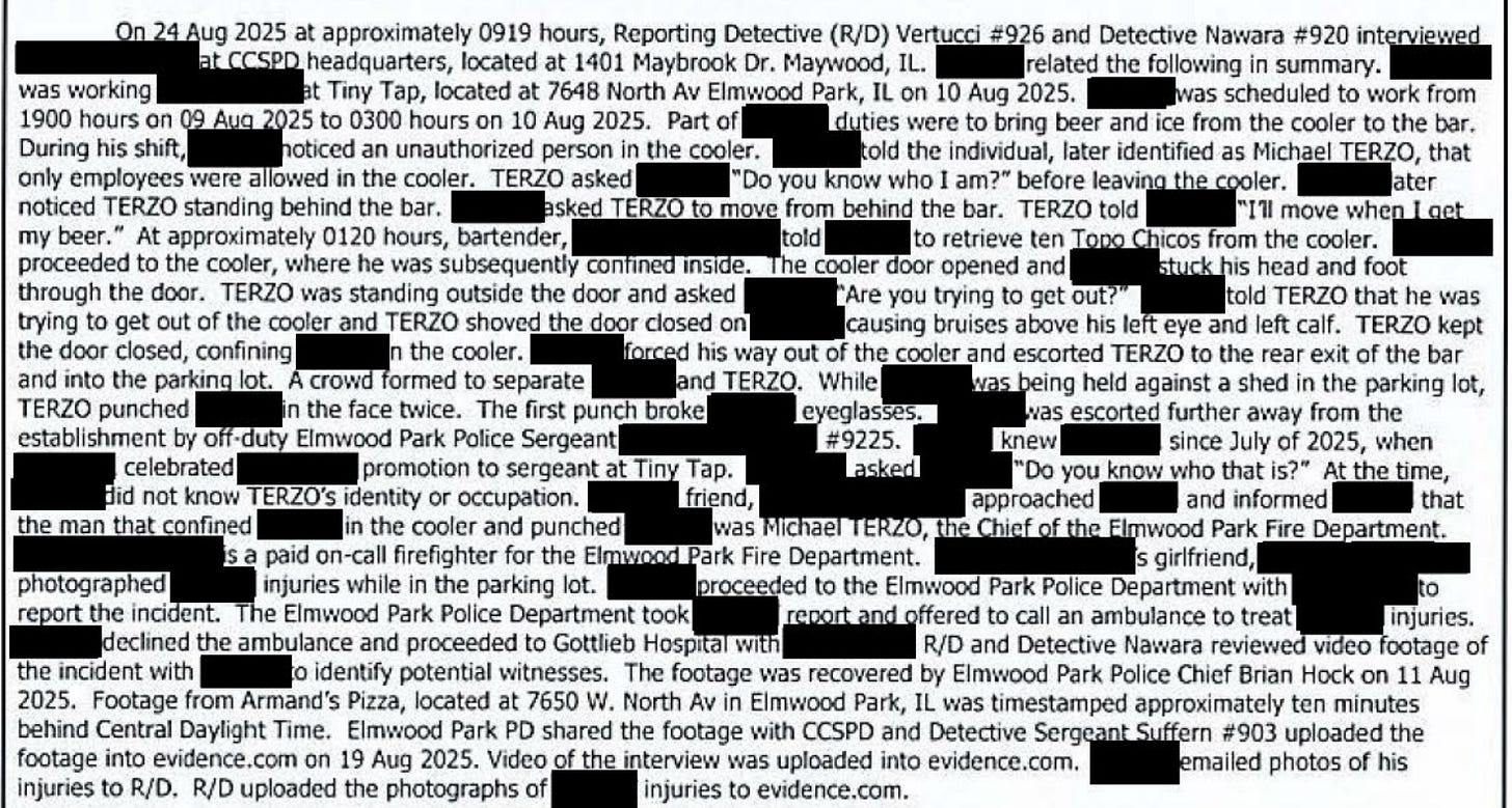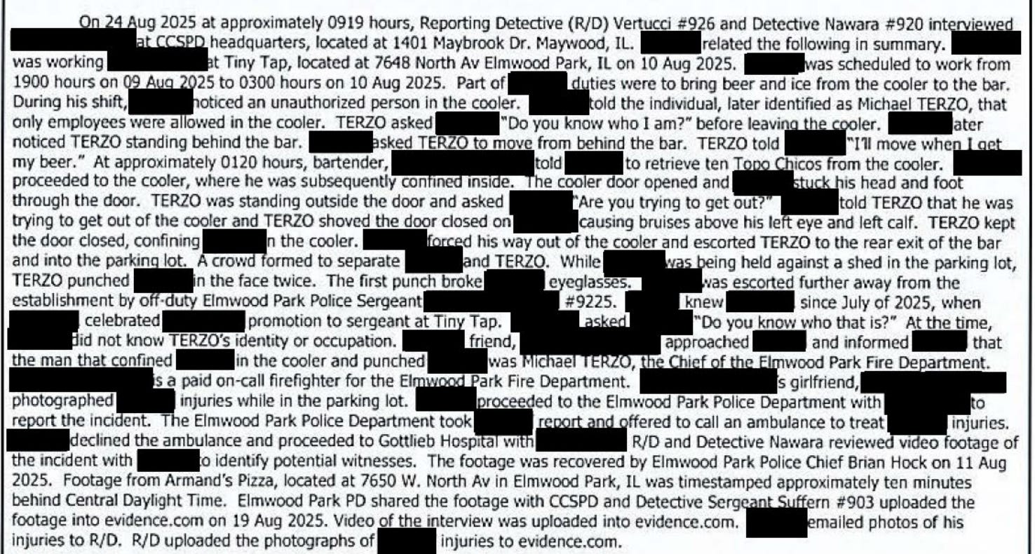 The incident occurred on August 10, the same weekend as the Taste of Elmwood Park, and the Chicago Sun-Times was the first to publish a report based on police records from the Cook County Sheriff’s Police Department (CCSPD). Terzo resigned from his position as fire chief on August 14.