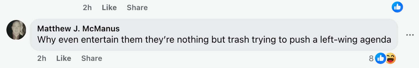The library director scrolled through comments on this post and liked a particularly disparaging comment from River Grove Library Board trustee Matthew McManus: “Why even entertain them they’re nothing but trash trying to push a left-wing agenda.”