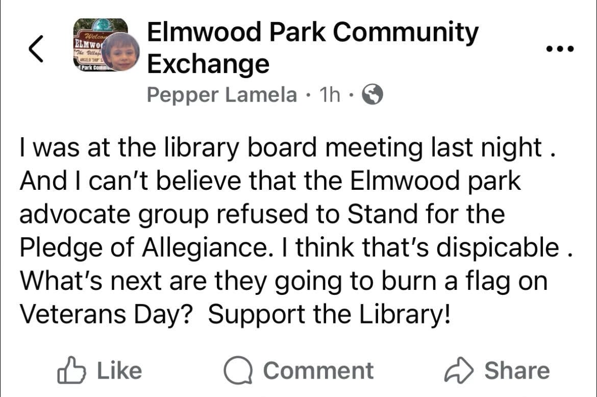 A Facebook profile with the name “Pepper Lamela” posted that they were at the library board meeting. They objected to the “Elmwood park advocate group” refusing to “Stand for the Pledge of Allegiance. I think that’s dispicable [sic].”