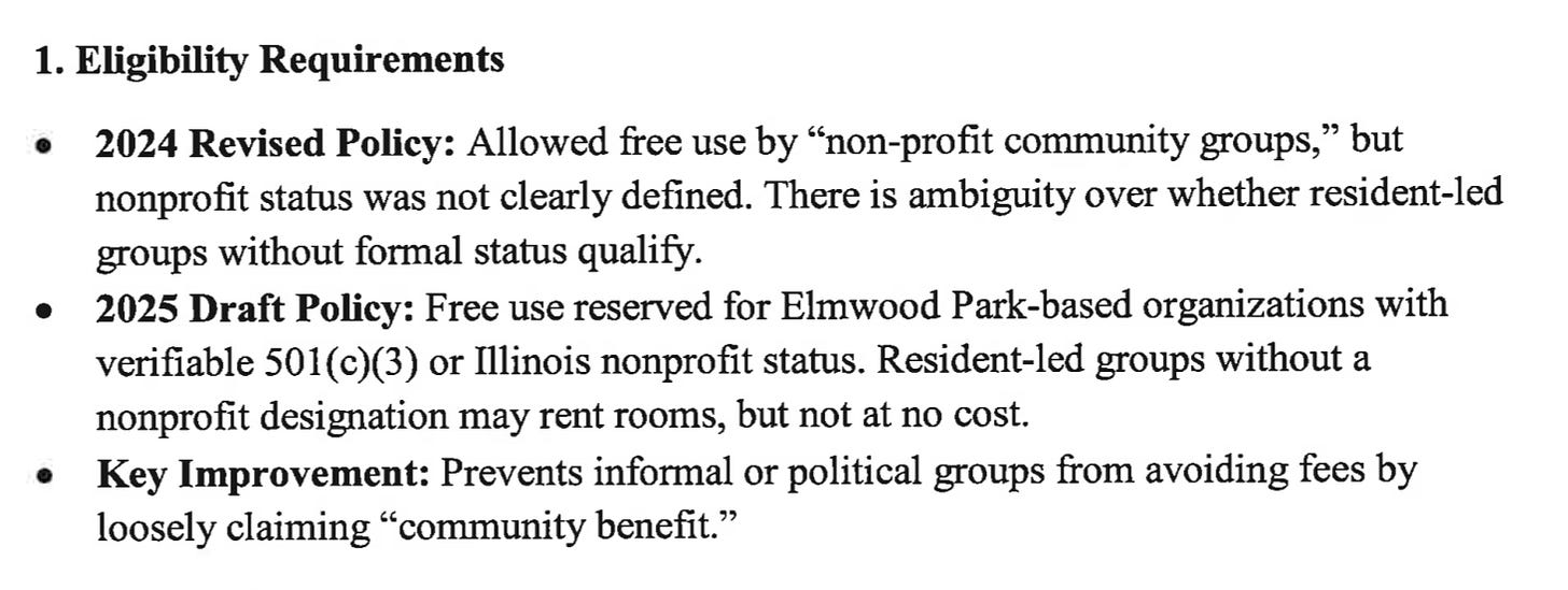 That adds to the argument that if the Elmwood Park Public library director and library board wanted to charge community groups or residents they would have specifically defined this fee when revising the policy in February 2013, July 2015, July 2017, August 2020, and November 2024.