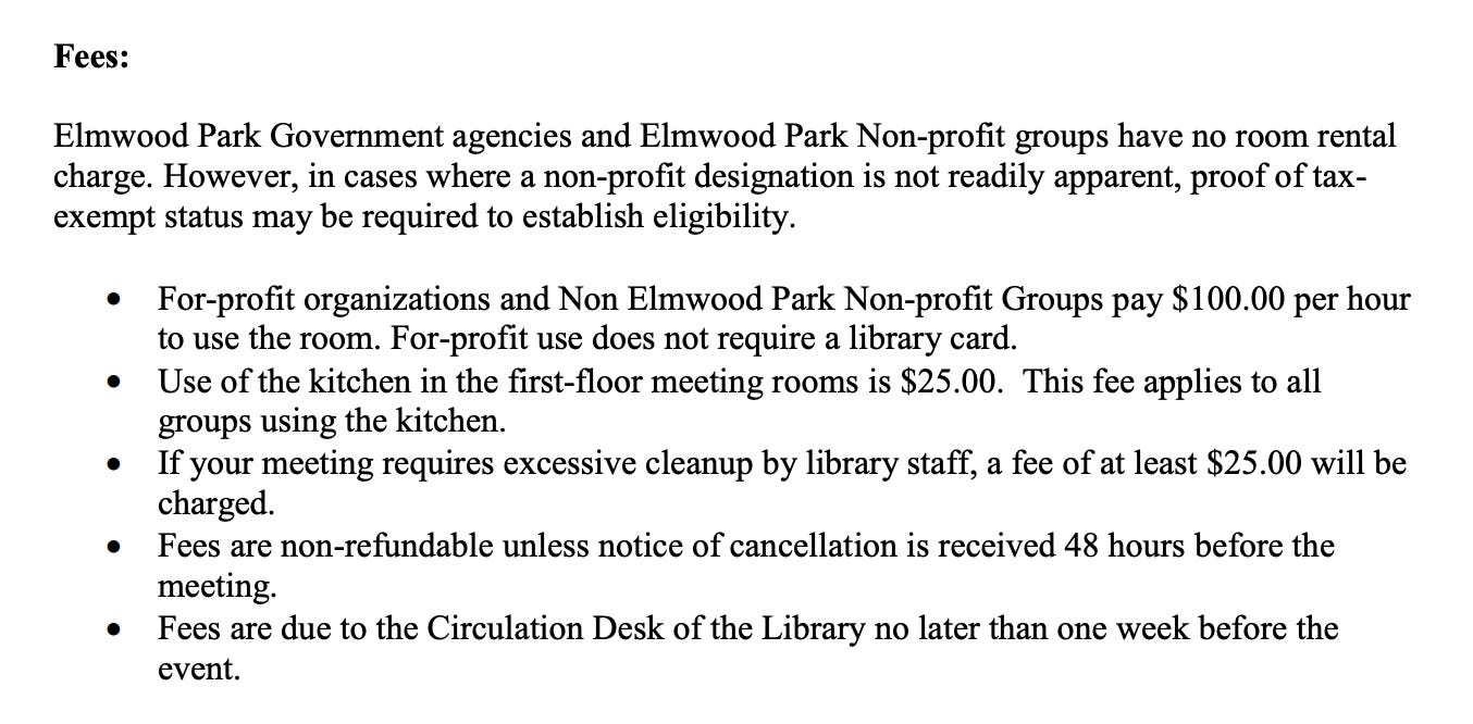 The only fee listed for meeting room use applies to “for-profit organizations and non-Elmwood Park non-profit groups.” They are expected to pay $100/hour for meeting room use.