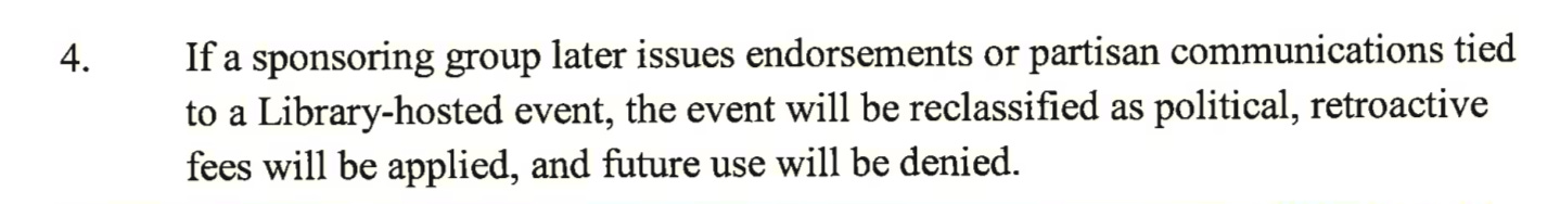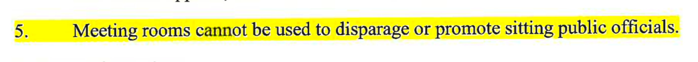 If enacted, it would mean that the library director would police speech that groups and residents engage in outside of the library in order to determine who is eligible or disqualified from using the meeting rooms. This would be blatantly unconstitutional.