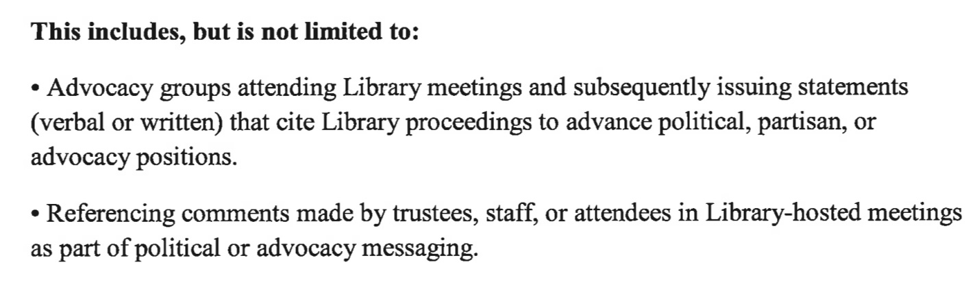 The censorship provision would further apply to “advocacy groups” and “referencing comments made by trustees, staff or attendees” at library meetings.